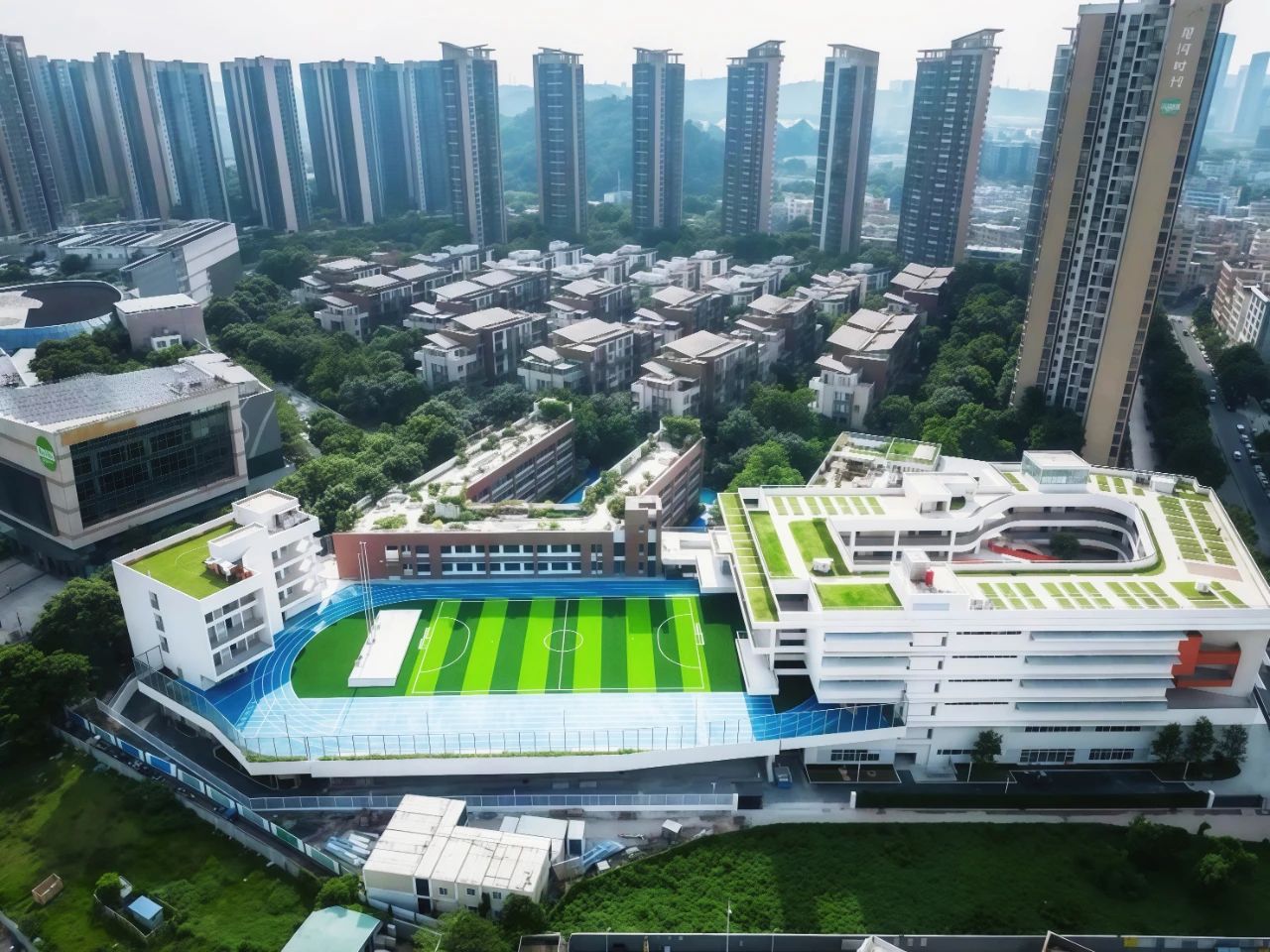 設(shè)計亮點:在深圳高密度城市背景下采用垂直校園建設(shè),以“客家圍屋”格局形成北側(cè)為“知識”自然書院、南側(cè)為“運動”活力場院的南北兩進(jìn)院落;校園通過擴建增加?xùn)|側(cè)展示架,西側(cè)打造屋面活動平臺,北側(cè)布置新建教學(xué)樓,底部架空中心庭院穿插于建筑內(nèi)部,不同標(biāo)高退臺與屋面構(gòu)成空中垂直綠化空間、新老建筑之間設(shè)計的綜合體系。