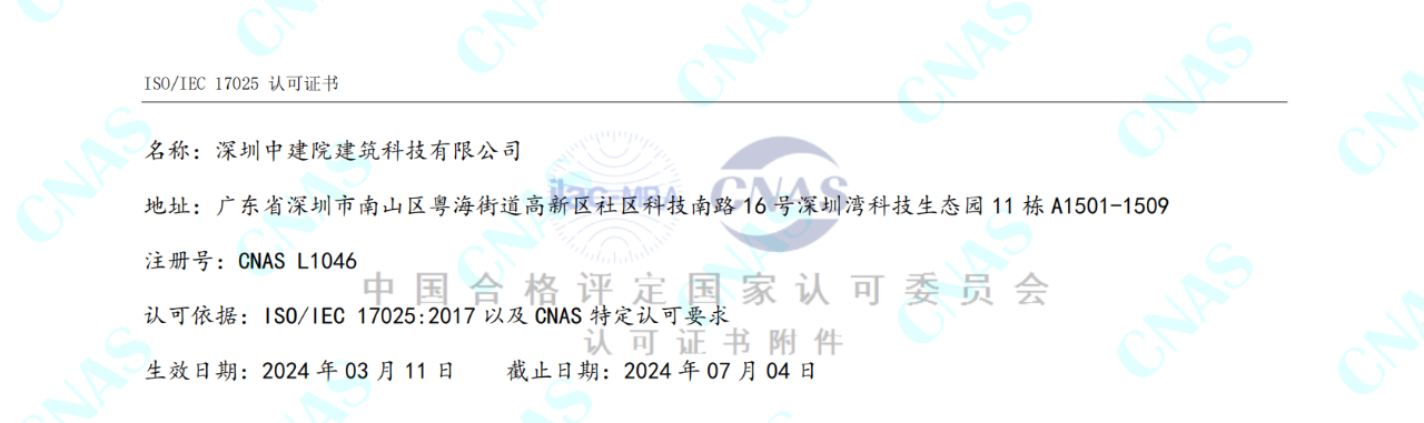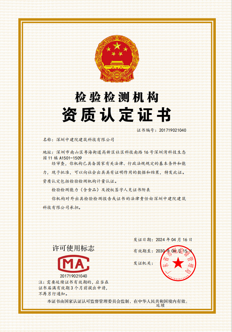深圳中建院綜合檢測實驗室建設工作進展順利,建筑節能、綠色建筑新增項目已取得CNAS 、CMA資質擴項證書,幕墻實驗室已完成設備主體安裝工作,繼續進行資質能力建設及部分新增項目擴項審核工作。